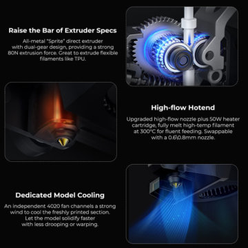 Der Ganzmetall-Direktextruder „Sprite“ ist mit Doppelzahnrädern versehen und hat eine Extrusionskraft von 80 N. Er kann somit flexible Filamente wie TPU hervorragend verarbeiten. Die 50 W Heizpatrone schmilzt das Hochtemperatur-Filament bei bis zu 300 Grad Celsius vollständig auf und sorgt für einen fließenden Vorschub. Die standardmäßig eingebaute 0,4 mm Düse kann gegen eine 0,6- oder 0,8 mm Düse ausgetauscht werden. Zur Ausstattung gehört auch ein 4020 Luftkühler, der den gerade gedruckten Abschnitt mittels Luftstroms abkühlt. Dadurch verringert sich die Gefahr von Verziehungen. Wie bereits erwähnt, kann der Creality CR-M4 3D-Drucker viele Filamente verarbeiten. Dazu gehören unter anderem PLA, PA, ABS, PLA-CF, PLA-Wood, flexibles TPU und PETG.