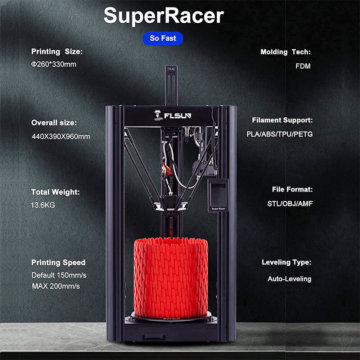 Bei dem 3D-Drucker-Modell Super Racer aus dem Hause FLSUN handelt es sich um einen sehr preiswerten FDM-Desktop-3D-Drucker, der die 3D-Druck-Ideen im Handumdrehen wahr werden lässt und die Bedürfnisse einer großen Anzahl von Zielgruppen erfüllt. Der Super Racer, vom Bautyp ein Delta-3D-Drucker, verfügt über zahlreiche smarte Funktionen, darunter 4 ultra-leise TMC2209 Steppertreiber, einen kapazitativen 3,5-Zoll-großen Farb-Touchscreen sowie eine automatische Bettnivellierung.