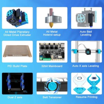 Unterstützt werden der UART-Modus und weitere Modifikationen bzw. Upgrades. Durch den UART-Modus können weitere Änderungen vorgenommen werden. Wer mit Sovol SV06 in den 3D-Druck einsteigen möchte, sollte nach Empfehlung des Unternehmens den Drucker erst einmal nicht modifizieren. Mit der G34 Z Align Funktion wird jeder an der Z-Achse befestigte Motor für die Einrichtung der X-Achse unabhängig eingestellt. Für eine noch bessere Präzision sorgen die doppelte Z-Achse und starke Schrittmachermotoren sowie die Riemenspanner zum Drehen. Die Düse erreicht eine Genauigkeit von 0,001 mm. Der Sovol SV06 verfügt zudem über eine Resume-Printing-Funktion, setzt also seine Tätigkeit nach einem Stromausfall an gleicher Stelle fort.