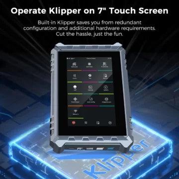 Das 300°C All-Metal-Hotend mit gehärteter Stahldüse ist besonders widerstandsfähig und erlaubt das Drucken von abrasiven Materialien wie Kohlefaser und PETG. Darüber hinaus ist das Gerät bereits mit der Klipper-Firmware ausgestattet, die für eine optimierte Druckgeschwindigkeit und einfache Fernsteuerung per WiFi sorgt. Der große, hochauflösende 7-Zoll-Touchscreen bietet eine intuitive Bedienoberfläche und erleichtert das Handling erheblich. LEDs am Hotend sorgen zudem für eine gute Sicht auf den Druckfortschritt, selbst bei schwachem Umgebungslicht.