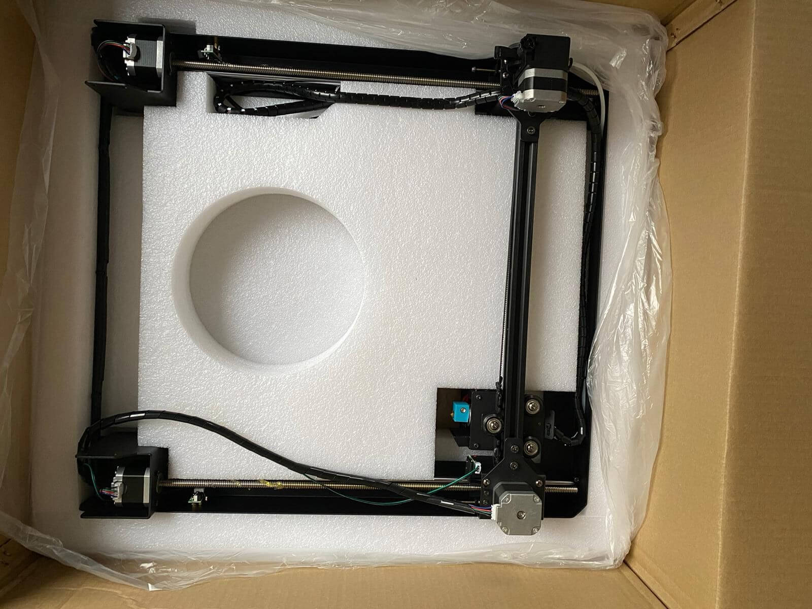 Der Mega X kam ordentlich verpackt bei uns an. Der vormontierte Rahmen und auch die Druckfläche waren separat eingepackt, desgleichen das Montagematerial und Werkzeug. Anhand der beiliegenden Aufbauanleitung stellte die Montage für uns kein großes Problem dar. Es mussten nur noch der Rahmen am Druckbett befestigt und die Kabel eingesteckt werden. Zugleich kontrollierten wir auch die Lager und die Zahnriemen. Das an der Y-Achse befindliche Hotend ist mit kugelgelagerten Laufrädern ausgestattet, die wir ebenfalls noch einmal kontrollierten und etwas nachzogen. Auf der Y-Achse kann bei Bedarf der Riemen fester gezogen werden.