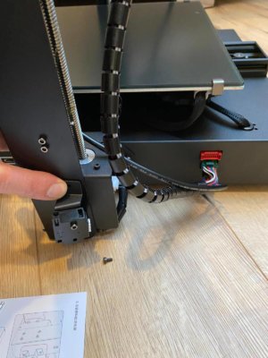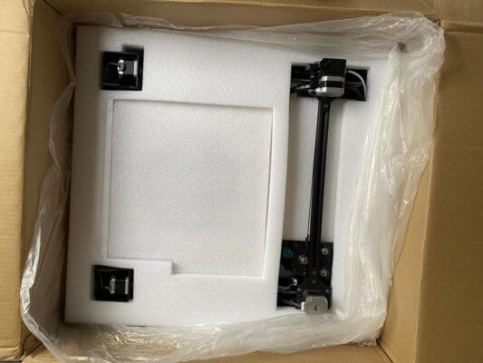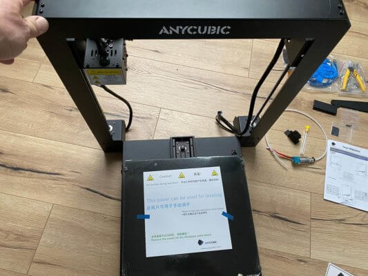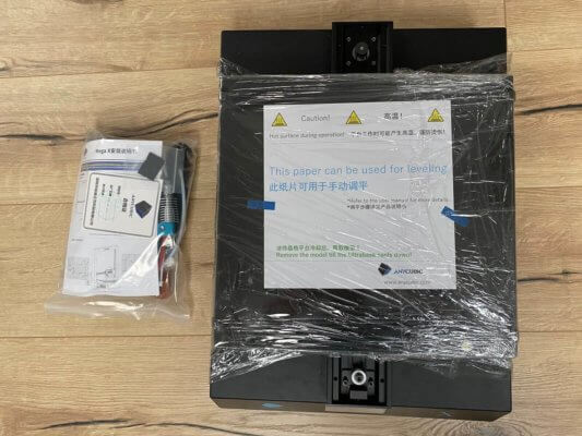 Der Mega X kam ordentlich verpackt bei uns an. Der vormontierte Rahmen und auch die Druckfläche waren separat eingepackt, desgleichen das Montagematerial und Werkzeug. Anhand der beiliegenden Aufbauanleitung stellte die Montage für uns kein großes Problem dar. Es mussten nur noch der Rahmen am Druckbett befestigt und die Kabel eingesteckt werden. Zugleich kontrollierten wir auch die Lager und die Zahnriemen. Das an der Y-Achse befindliche Hotend ist mit kugelgelagerten Laufrädern ausgestattet, die wir ebenfalls noch einmal kontrollierten und etwas nachzogen. Auf der Y-Achse kann bei Bedarf der Riemen fester gezogen werden.