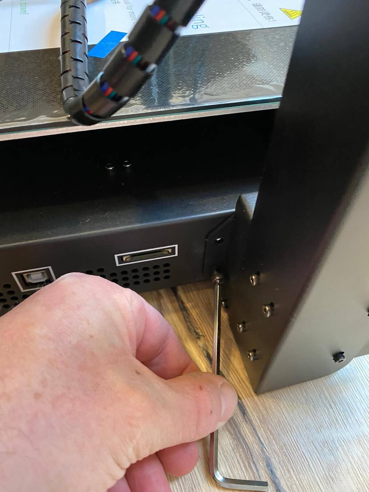 Der Mega X kam ordentlich verpackt bei uns an. Der vormontierte Rahmen und auch die Druckfläche waren separat eingepackt, desgleichen das Montagematerial und Werkzeug. Anhand der beiliegenden Aufbauanleitung stellte die Montage für uns kein großes Problem dar. Es mussten nur noch der Rahmen am Druckbett befestigt und die Kabel eingesteckt werden. Zugleich kontrollierten wir auch die Lager und die Zahnriemen. Das an der Y-Achse befindliche Hotend ist mit kugelgelagerten Laufrädern ausgestattet, die wir ebenfalls noch einmal kontrollierten und etwas nachzogen. Auf der Y-Achse kann bei Bedarf der Riemen fester gezogen werden.