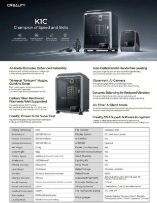 Mit einer schnellen und benutzerfreundlichen Einrichtung, die vom Auspacken bis zum ersten Druck nur wenige Minuten in Anspruch nimmt, und einem robusten Design, das auf Langlebigkeit ausgelegt ist, steht der K1C sowohl für Hobbyisten als auch für Profis an der Spitze der Technologie. Ob es um die Herstellung von Prototypen, Kunstwerken oder industriellen Teilen geht, der K1C ist ein zuverlässiger Partner, der Präzision und Geschwindigkeit vereint, um Ihre kreativsten Ideen zum Leben zu erwecken.