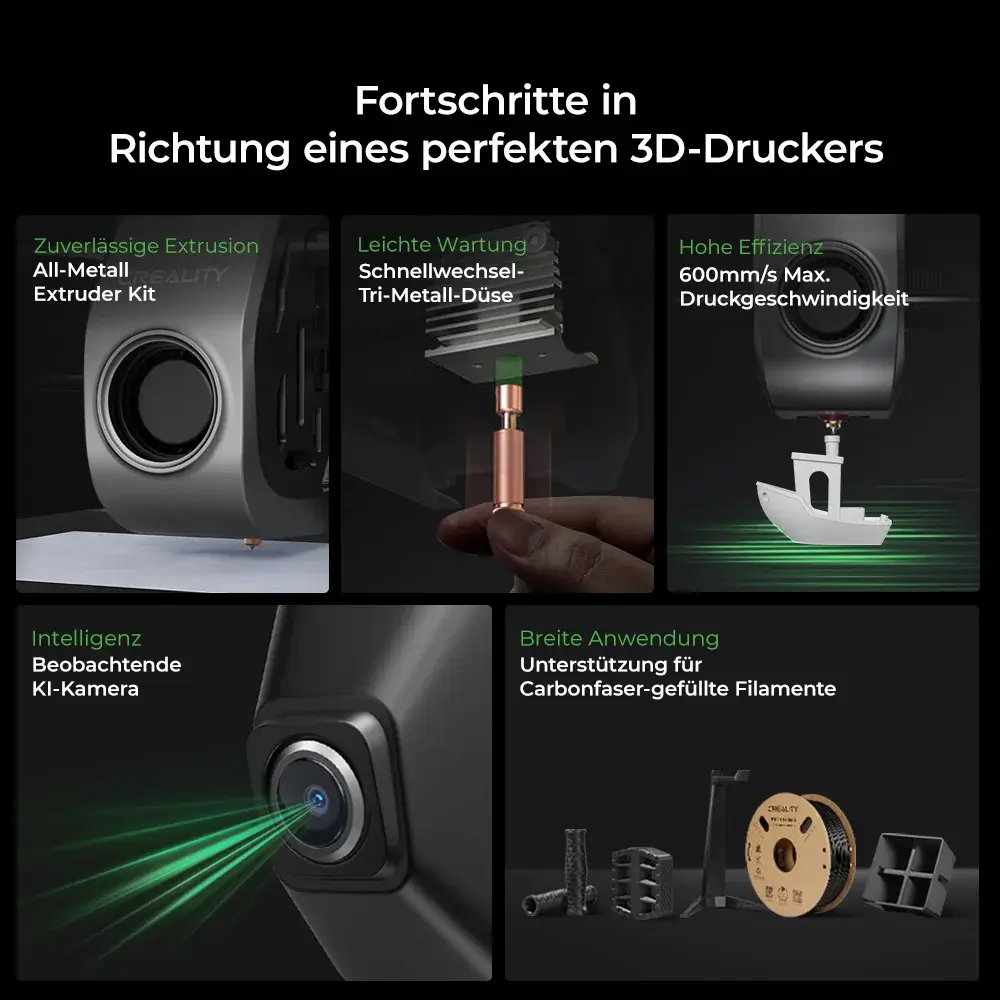 Der Creality K1C zeichnet sich durch eine Reihe von besonderen Funktionen und Merkmalen aus, die ihn von anderen 3D-Druckern in seiner Klasse abheben. Ein herausragendes Merkmal ist das vollmetallische Extrusionssystem, das für seine hohe Präzision und Zuverlässigkeit beim Drucken mit einer Vielzahl von Materialien, einschließlich anspruchsvollerer Filamente wie Carbonfaser-verbundene Materialien, bekannt ist. Diese Fähigkeit erweitert die Einsatzmöglichkeiten des K1C erheblich und macht ihn zu einem vielseitigen Werkzeug für anspruchsvolle Anwendungen in Bereichen wie Prototypenbau, Bildung und Hobby.