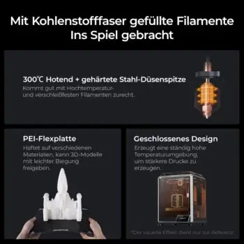 - 2. Kompatibilität Mit Kohlenstofffaserfilamenten: Der schnellste Desktop-3D-Drucker Creality K1C ist für die Verwendung von Kohlefaserfilamenten optimiert und bietet Benutzern die Möglichkeit, die mechanische Festigkeit und Dimensionsstabilität von mit Kohlefaser gefüllten Filamenten zu nutzen