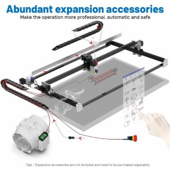 Ein Air Assist bläst Luft in den Schnittbereich des Lasers und entfernt dadurch Rauch und Schmutz vom Gravur- und Schneidebereich. Dadurch wird verhindert, dass die Linse verschmutzt und schneller verschleißt. Der NEJE 3 Max ist mit einem automatischen Air Assist Kit ausgestattet mit einer Schleppkette für die Absaugung. Für die optimale Unterstützung des Air Assists bietet NEJE auch eine STL-Datei, mit der der Anwender eine 3D-gedruckte Erweiterung von 30 oder 55 mm zum Air Assist drucken kann.